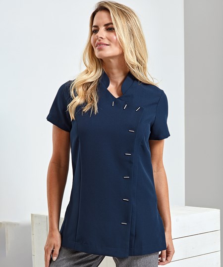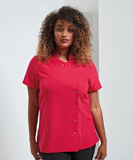 Deze populaire 'Orchid'-tuniek is verkrijgbaar in een breed scala aan kleuren en heeft een asymmetrisch ontwerp met acht 'bar'-knopen aan de voorkant. De zijsplitten en prinsessennaden zorgen voor een flatterende pasvorm, de korte mouwen en rugplooi bieden een volledig bewegingsgemak. Een geweldige uniforme oplossing voor salonpersoneel dat er gecoördineerd uit moet zien.