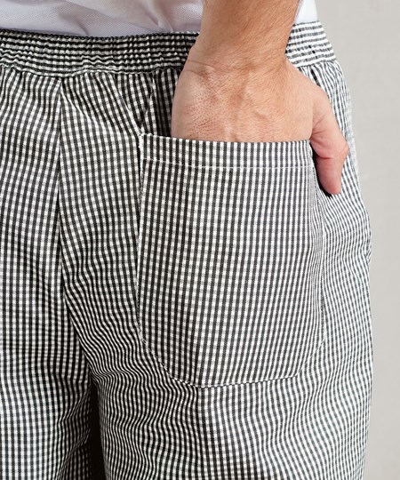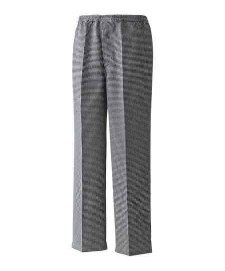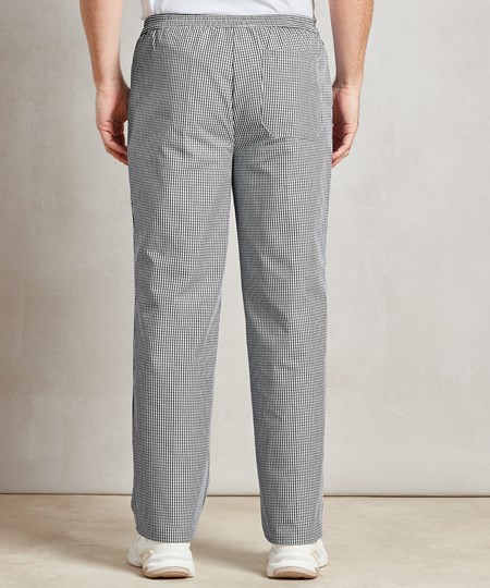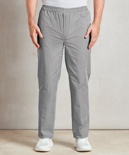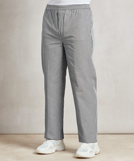Een traditionele koksbroek verkrijgbaar in twee populaire kleuren met kleine ruitjes. Een gemakkelijke, comfortabele pull-on-stijl voor maximaal comfort tijdens lange diensten in de keuken. Met een elastische tailleband, een rits en een handige achterzak.