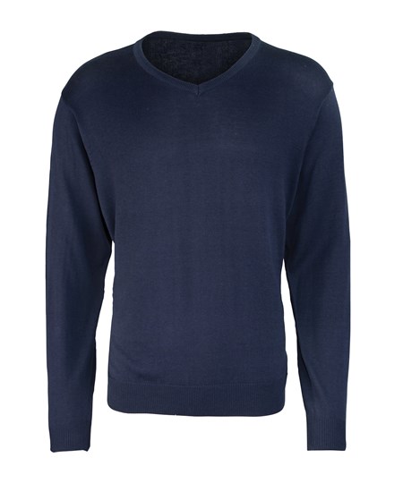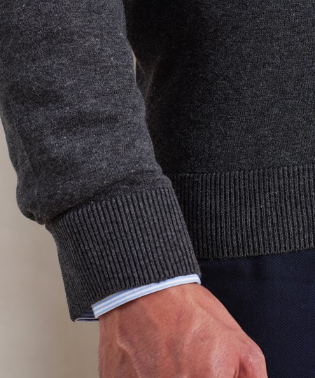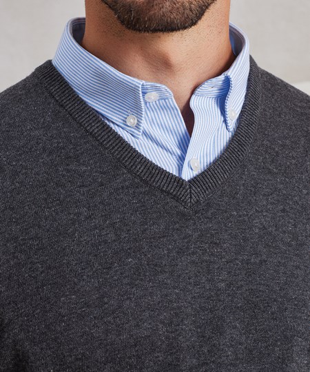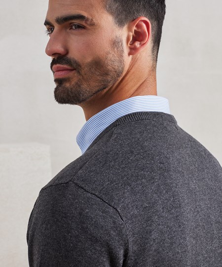 Een herentrui met V-hals met lange mouwen gemaakt met een fijngebreid katoenrijk garen voor een zacht en comfortabel gevoel. De ingezette mouwen en zoom geven de jumper een eigentijds tintje, waardoor dit een geweldig stuk is om over een hemd te dragen.