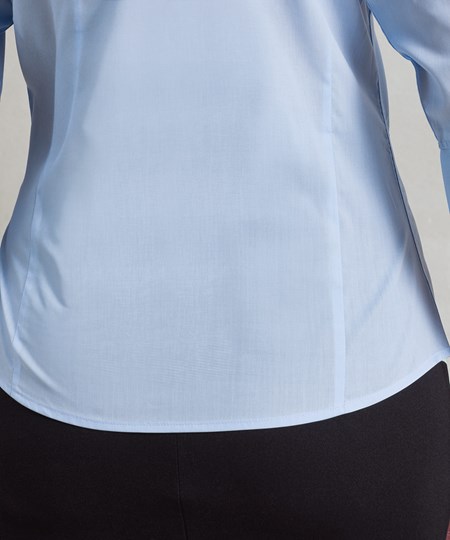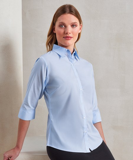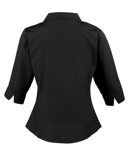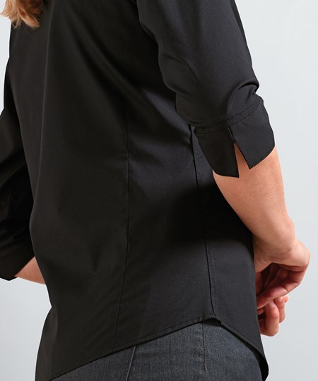 Een half-aansluitende blouse voor dames die de draagster een modieuze driekwartsmouw biedt. De mouw is afgewerkt met een nette zijmanchet, en de borst en rug hebben een flatterende snit die de blouse een aansluitend uiterlijk geeft.