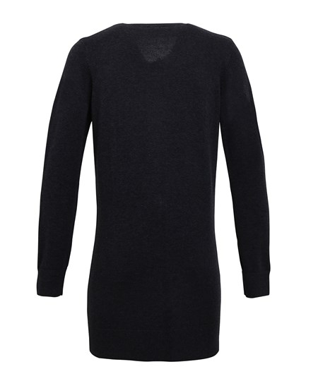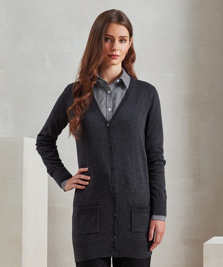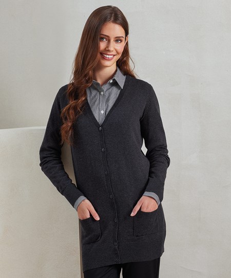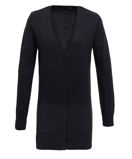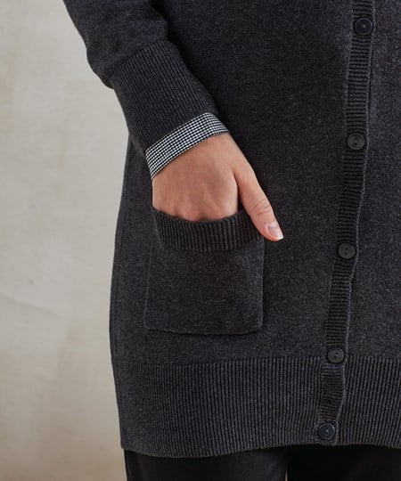 Vrouwen kunnen stijlvol in laagjes werken met deze modieuze lange gebreide cardigan. Als weerspiegeling van de modetrends in breigoed kan deze katoenrijke cardigan voor vrouwen los gedragen worden over een bloes of dichtgeknoopt worden. De geribde gebreide lage v-hals, manchetten en zoom zorgen voor comfort tijdens het dragen en vormvastheid.