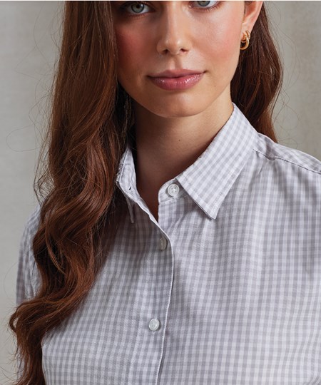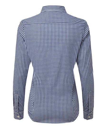 Een aantrekkelijk gingham patroon overhemd met lange mouwen in sterk contrasterende kleuren. Met enkele manchetknoop en mouwophouder. Afgewerkt met een smalle zachte kraag met ‘button-down’ optie aan de onderkant. Een strijkvrij, duurzaam , geruit damesoverhemd dat een vriendelijke, stijlvolle uitstraling geeft aan bedieningsmedewerkers.