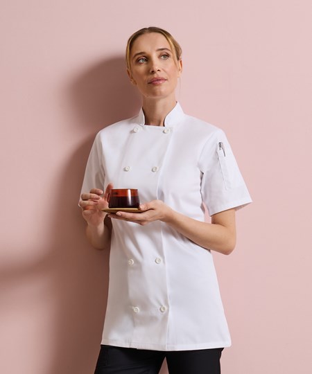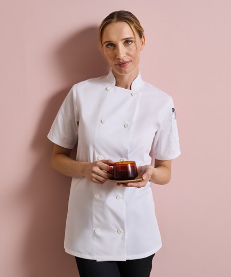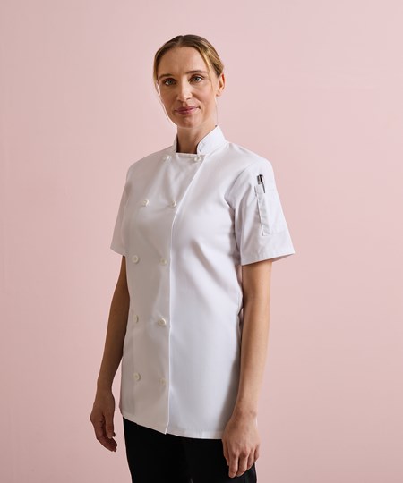 Deze jas met lange mouwen is een welkome aanvulling op de bestaande Premier-collectie van kokskleding en is ontworpen voor dames. Met een meer aansluitende pasvorm rond de bovenarm, taille en borst, is deze jas comfortabel en ruim genoeg om te werken in drukke keukens. De linkerarm heeft een handig balpenzakje.