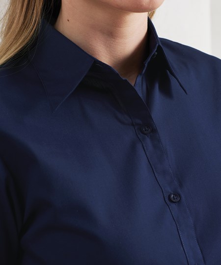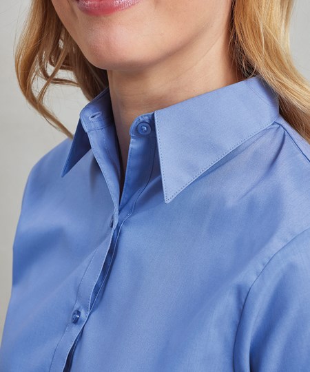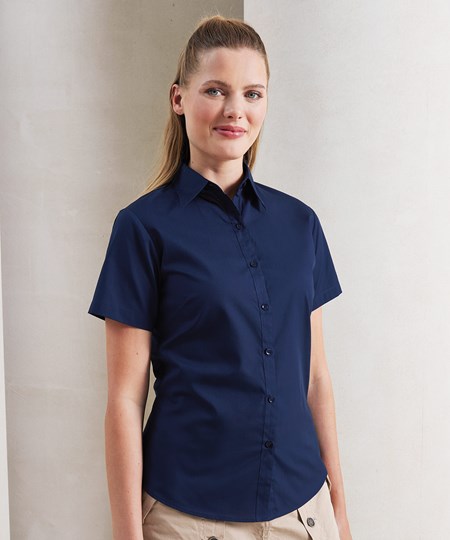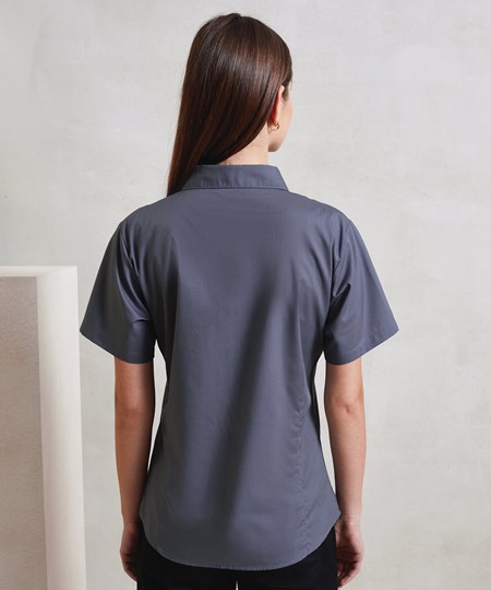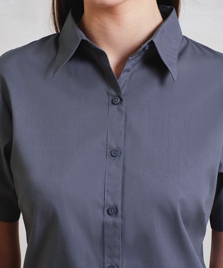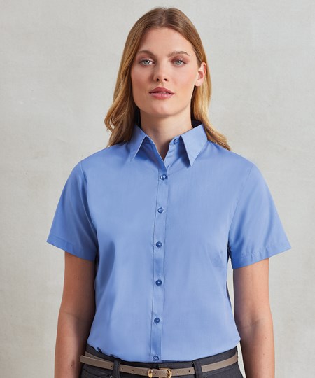 Een poplinblouse voor dames met korte mouwen met half-aansluitende pasvorm, verkrijgbaar in 30 kleuren. De blouse heeft een zachte kraagstijl met figuurnaden op de borst en rug en een ronde onderzoom voor een aantrekkelijke werkkledij voor dames.