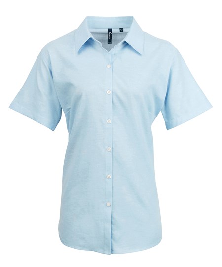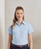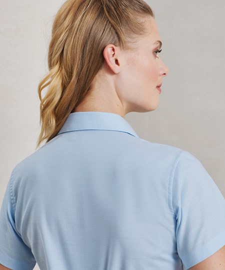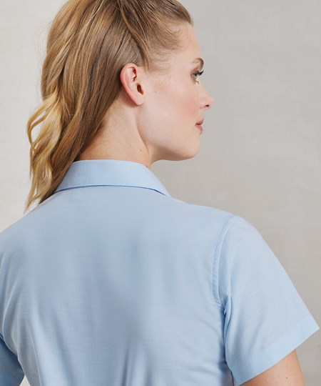 Deze Oxford blouse voor dames met korte mouwen is een essentieel kledingstuk tijdens de warmere maanden. Figuurnaden op de borst en de rug zorgen voor een flatterende pasvorm en de zachte kraag en de ronde onderzoom zorgen voor een vrouwelijke werkblouse.