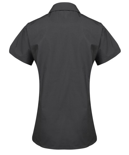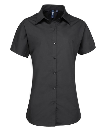 Een Supreme poplinblouse voor dames met korte mouwen, gemaakt van een zwaar materiaal, resulterend in een duurzame blouse met een verbeterd uiterlijk. De aansluitende pasvorm, zachte kraag en ronde zoom zorgen voor een flatterende pasvorm, wat resulteert in een geweldige alledaagse werkblouse.