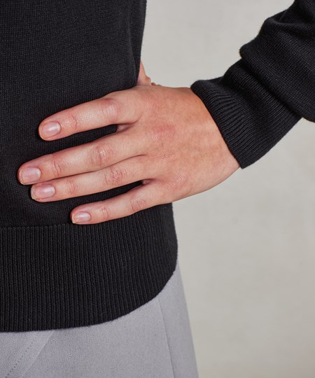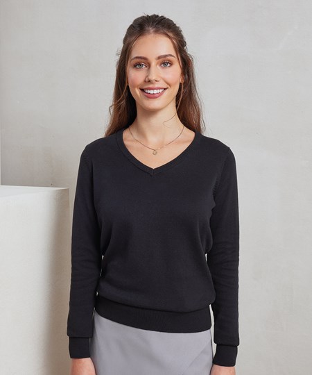 Een damesjumper met V-hals gemaakt van een fijngebreid, katoenrijk garen. De V-halsstijl betekent dat deze damessweater over een blouse met een sjaal om de hals kan worden gedragen. De mouwen en zoom zijn gemaakt voor een echt eigentijds stuk dat perfect is voor professionele kantooromgevingen.
