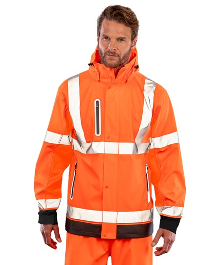 Veiligheidsjas in Scandinavische stijl met capuchon in zwaardere waterdichte luxe stof met reflecterende bedrukte veiligheidsbanden.
