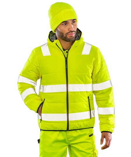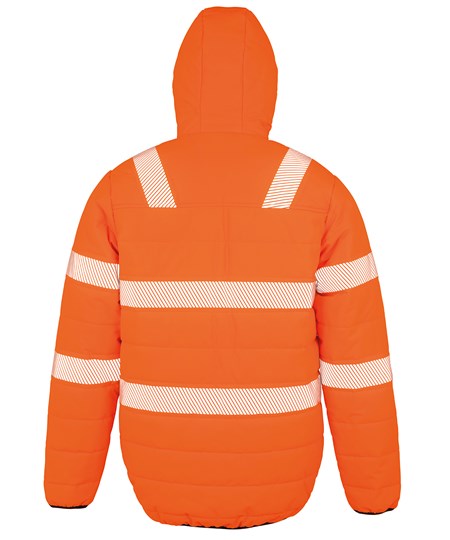 Stevig, warm en gerecycled: een gewatteerd, bedrukbaar veiligheidsjack met capuchon en een waterafstotende afwerking.