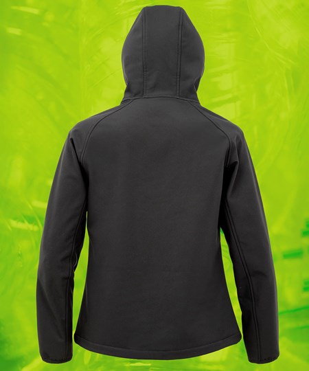 Een geweldig zittende, nette en duurzame damessoftshell met capuchon, gemaakt van gerecyclede stof.