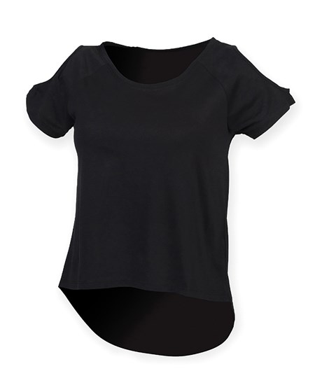 Kijk saaie T-shirts met de nek aan. Dit T-shirt met relaxte pasvorm, korte raglanmouwen, openingen in de schouders en ronde rugzoom is een fraai alternatief voor modebewuste vrouwen. Uitscheurbaar etiket voor eenvoudige rebranding.
