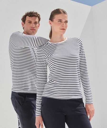 Met strepen zit je altijd goed. Speels. Maakt indruk. Een moderne klassieker. Vervaardigd van hoogwaardig gestreept katoenen jersey, dit zachte gestreepte unisex t-shirt met lange mouwen heeft een normale pasvorm zodat hij iedereen past. De geribde stretch hals en nekband zorgen voor een fantastische afwerking als het verwijderbare label weggehaald wordt voor merkwijziging. Past bij SF202 gestreept t-shirt.