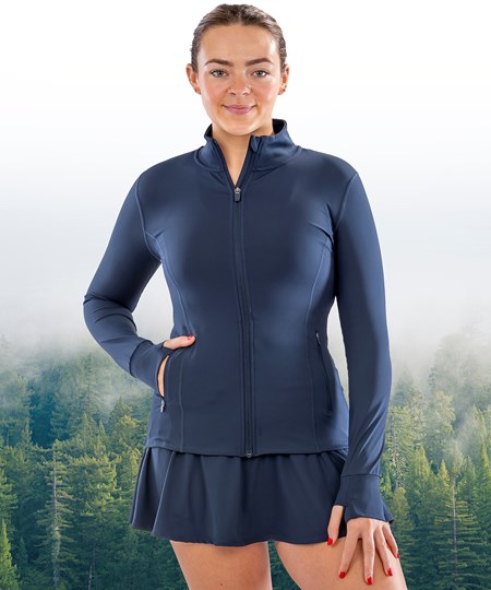Getailleerde en high-stretch sportjacks voor dames, gemaakt van gerecyclede stoffen. Ideaal voor tennis en andere sporten. Duimmanchet voorkomt oprollen van de mouw en draagt bij aan de bescherming van de handpalm.
