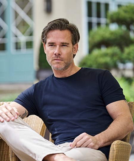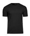 Aansluitende ronde hals met stretch voor heren. Met een smalle halsribboord met elastaan en een schouder-tot-schouder band ter versteviging.