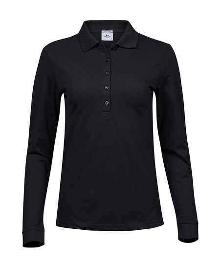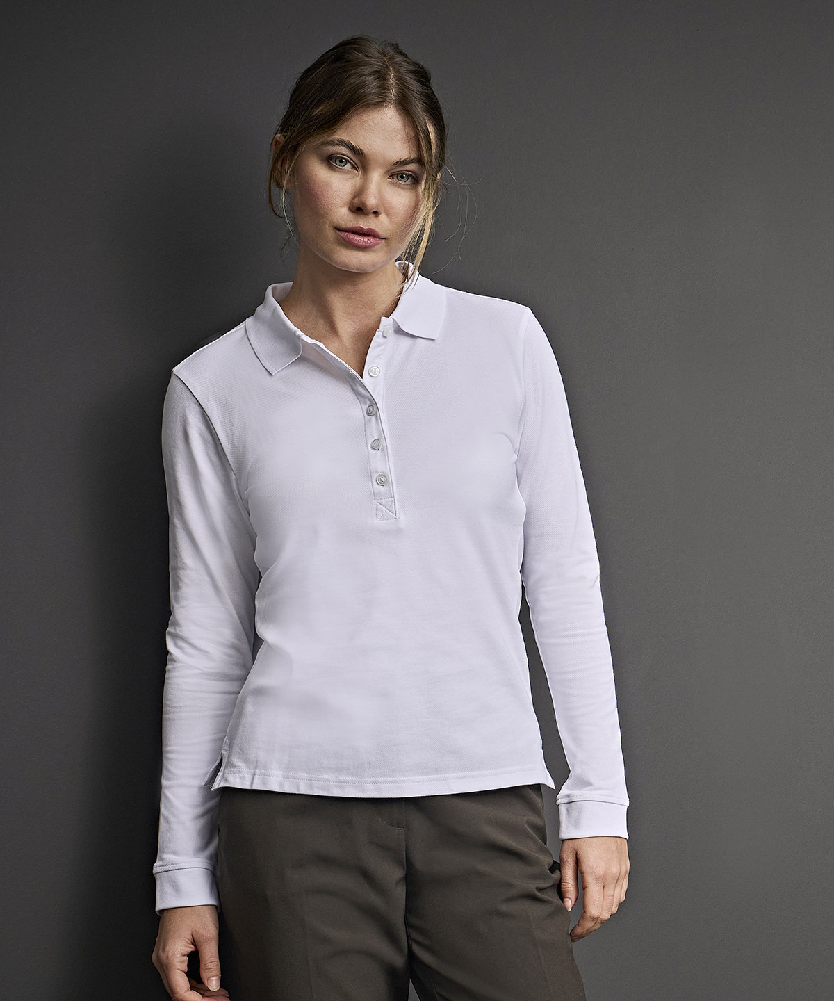 Deze luxueuze damespolo met lange mouwen is gemaakt van een gecertificeerd biologisch katoen/elastaan, dat zorgt voor uitstekend comfort en een perfecte pasvorm, met mini-piquéstof en een plat gebreide kraag met elastaan. De mouwen zijn afgewerkt met laag uitgesneden manchetten met elastaan.