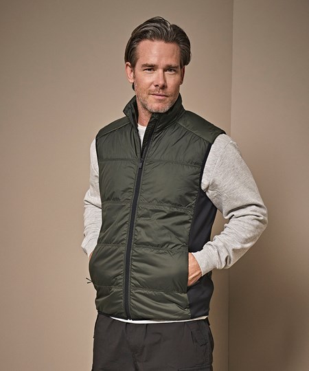 Deze hybrid stretchbodywarmer is gemaakt van 300T polyester in combinatie met stretch-fleece panden. Hij is geïsoleerd met een premium DuPont™-wattering op het lichaam. Deze bodywarmer heeft elastische band aan de zoom onderaan en bij de armsgaten voor een moderne look. Hij is voorzien van kwalitatieve SBS-ritsen, een binnenzak en twee grote verborgen zakken aan de voorkant.