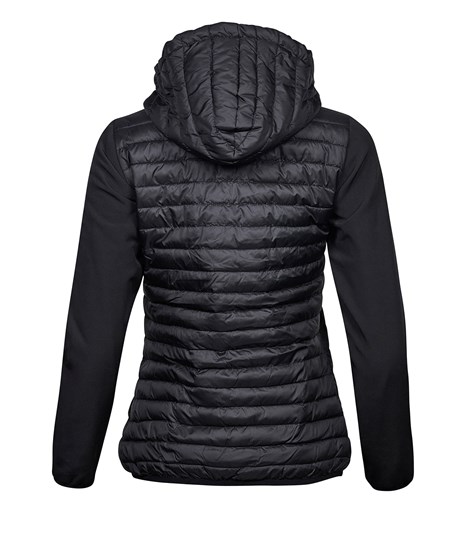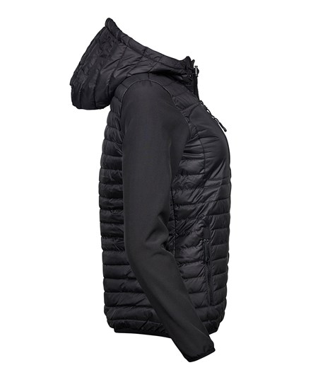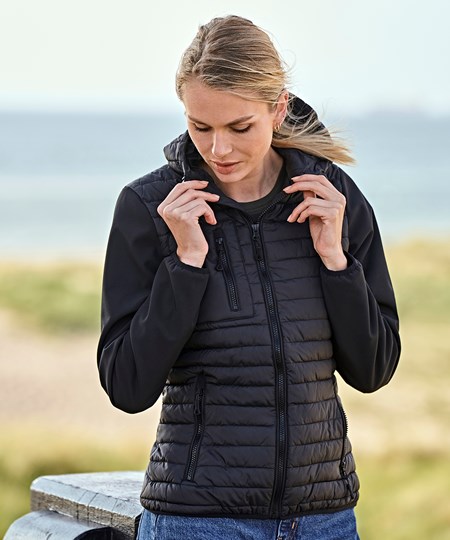 Dit coole Crossover jack voor dames met capuchon heeft prachtige details, zoals een borstzak met rits en een verstelbare capuchon, waardoor het zowel praktisch als modieus is. Voor een sportieve look hebben we een combinatie gebruikt van een lichte polyester 300T met wattering en softshell. Het jack heeft een verstelbare zoom, elastische manchetten, twee steekzakken en een binnenzak.