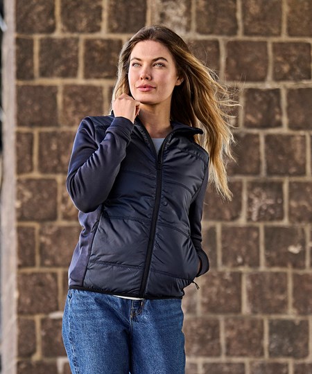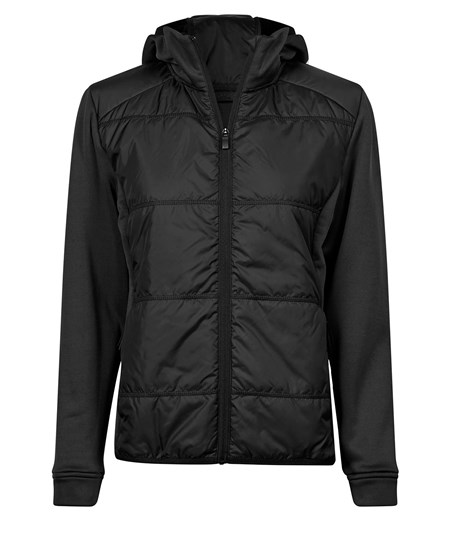 Dit hybrid stretchjack met capuchon voor dames is gemaakt van 300T polyester in combinatie met stretch-fleece panden en mouwen. Hij is geïsoleerd met een premium DuPont™-wattering op het lichaam. Manchetten en elastiek onderaan de zoom voor een moderne look. Hij is voorzien van kwalitatieve SBS-ritsen, een binnenzak en twee grote verborgen zakken aan de voorkant. De capuchon maakt dit jack extra comfortabel op koudere dagen.