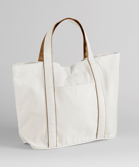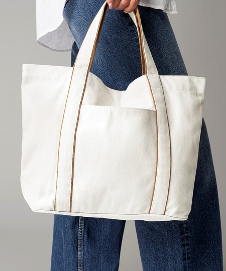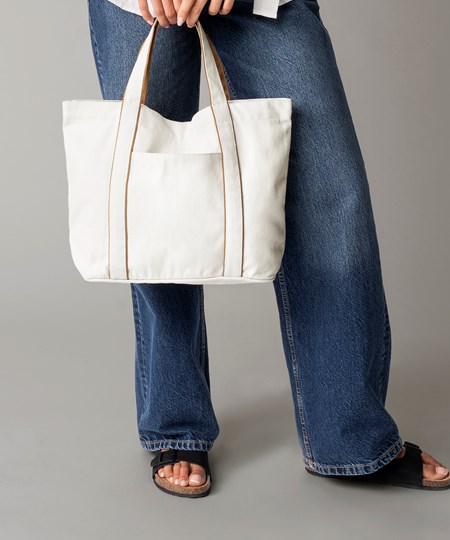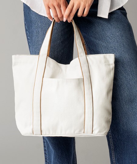 - Hoofdstof: 70% gerecycled katoen, 30% gerecycled polyester na consumptie. Contrasterende gekleurde biezen: 100% gerecycled katoen na consumptie (12oz/yd²)