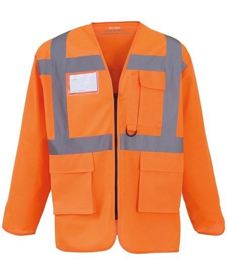 Fantastisch multifunctioneel executive vest met mouwen en ritssluiting vooraan, twee zakken met klittenbandsluiting vooraan, die ook toegankelijk zijn via de zijkant. Dit vest heeft ook een houder voor een ID-kaart op de rechterborst, grote zak voor walkie-talkie /mobiele telefoon, penzakken en sleutelhouder op de linkerborst. Dit is nodig voor Klasse 3 veiligheids- en zichtbaarheidsomgevingen.