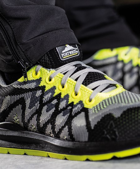 This safety trainer offers a recycled knitted upper. Designed for maximum safety, comfort and performance, the lightweight stylish construction features a super comfort gel footbed.