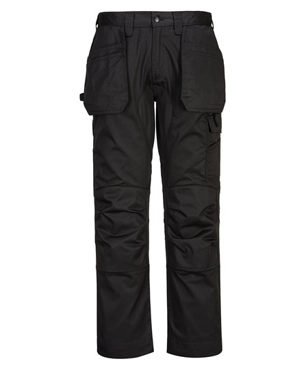 A durable polyester/cotton blend fabric allows for high-performance maximum range working, as well as comfort. Stretch panelling offers easy movement. Clever features include multifunctional holster pockets, top-loading kneepad pockets and an easy access multi-way thigh pocket for secure storage of phone, keys and tools.