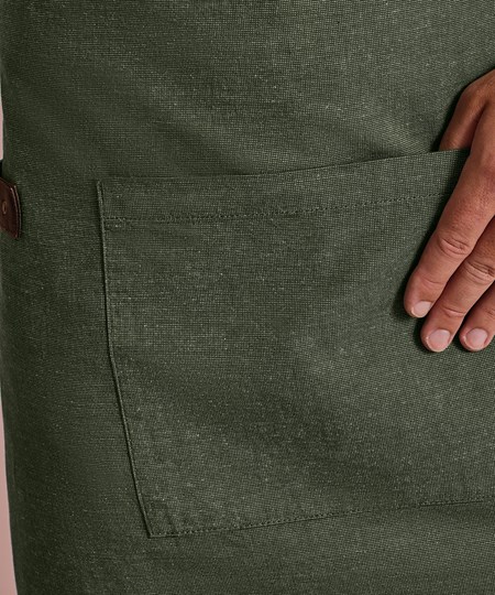 An attractive bib apron using yarn-dyed cotton threads that are woven together to create a pleasing contrast effect. To the centre lies a tablet-friendly pocket with combined pen pocket. A self-fabric tie can be looped through and secured in place using a double D-ring at the waist. Faux leather fabric features for decoration and practicality finish off this stunning apron.