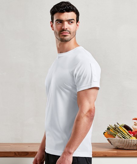 A causal alternative to a chefs jackets, this lightweight Coolchecker t-shirt is designed to draw moisture away from the body and is fast drying to ensure that chef keeps fresh and cool during service. There is a mesh panel on the back, together with underarm vent holes to the side to encourages air flow around the body. This style is available in either Black or White and features a handy pen pocket on the left arm.