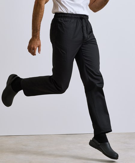 A great solution for chef and the team, these trousers offer a more fitted style on the leg but still remain comfortable for long shifts during service. Features a handy pocket on the right leg and a left rear patch pocket. Fastens with zip fly and draw cord and is finished with an elasticated waist.