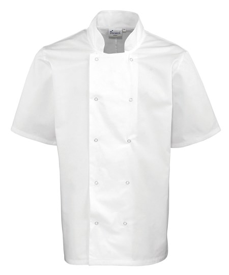 An easy-wearing short sleeve chef jacket with ten metal press studs in a popular wrap over style. Features a Mandarin Collar with topstitching and is available in Black or White.