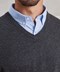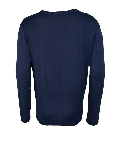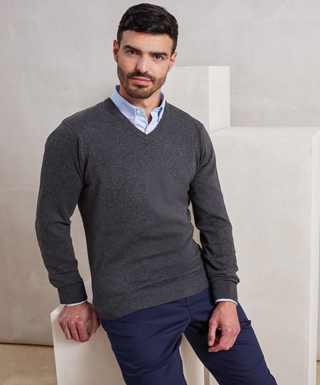 A V-neck long sleeve men's sweater made with a fine gauge knitted cotton rich yarn for a soft and comfortable feel. The set in sleeves and hem give a contemporary feel to the jumper making this a great piece to layer up over a shirt.