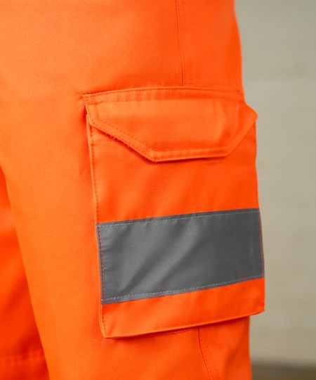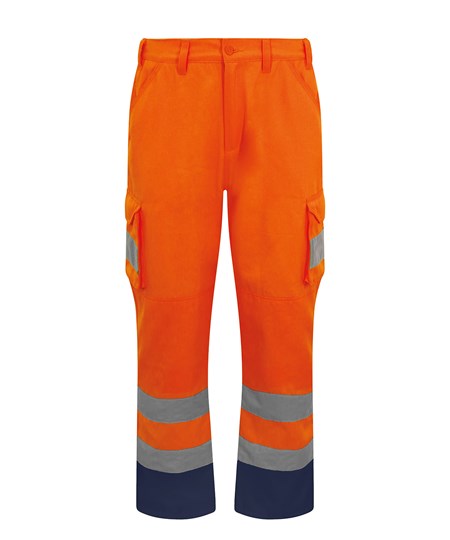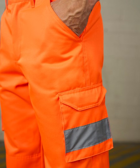 The high visibility cargo trouser perfectly completes your workwear needs. Made from a durable polycotton fabric with water-repellent finish. Available in high visibility yellow and orange with contrast navy hem providing level 1 protection and in solid navy for times where less protection is required.