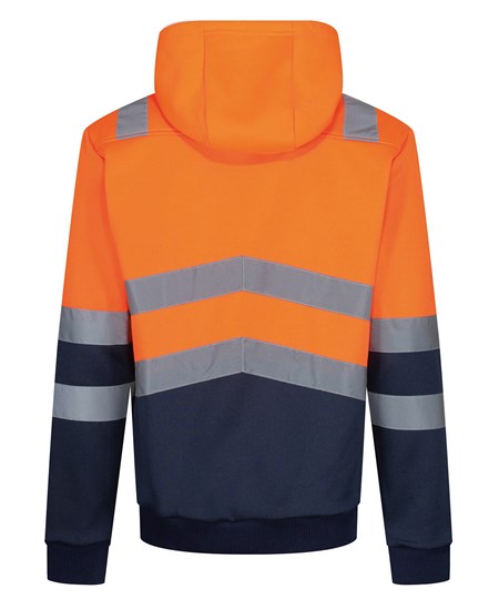 Stay visible in this hi-vis hoodie, made with a polycotton blend for comfort and durability. Pop on the hood for extra protection. Angled hi-vis chevrons show which way you’re facing in low light. Rest your hands in the kangaroo pocket. Conforms to EN ISO 20471:2013 +A1:2016 Class 2.