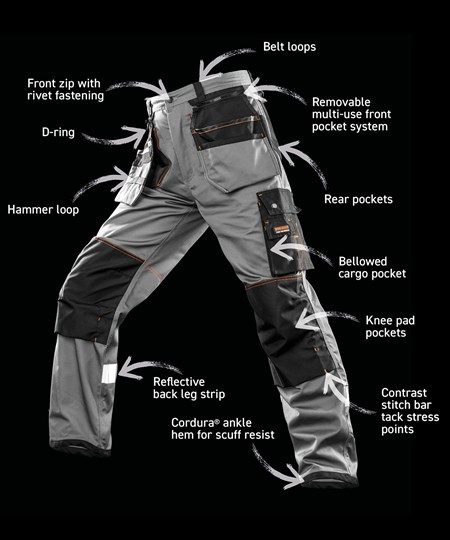 These super tough, heavyweight work trousers bring style and performance to a new level. Cordura knee panels and hem add scuff resistance while the reflective tapes add a touch of safety. Removable holster pockets, D-ring and bellowed rear cargo pockets create functionality to the new king of the work trouser!