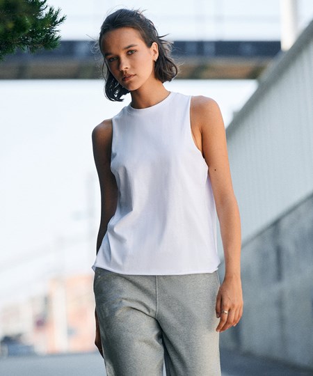 High fashion. High impact. It's all about style and freedom to move with this stretchy ribbed crew neck vest, with raw edge slash armholes and hem. Modern, athletic and cool. Features tear-out label for easy rebranding.