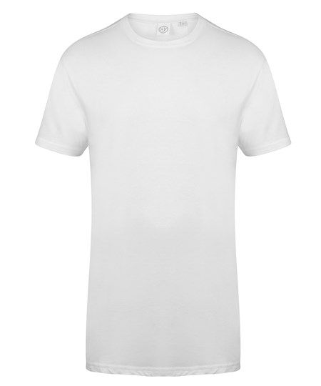 The extra long-length and regular fit at chest and shoulders provides great creative opportunities for a cool logo, motif or fashion slogan. With urban-feel drop tail hem and stretch ribbed crew neck finish. Tear-out label for easy rebranding.