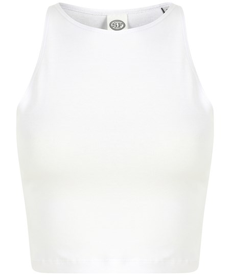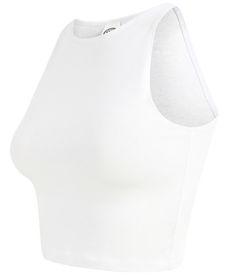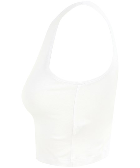 Sleeveless cropped top, with a fitted neckline that's ultra flattering on the shoulders. High fashion. High impact. Tear-out label for easy re-branding.