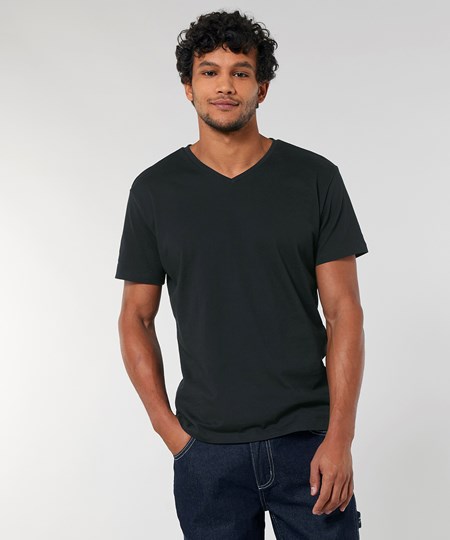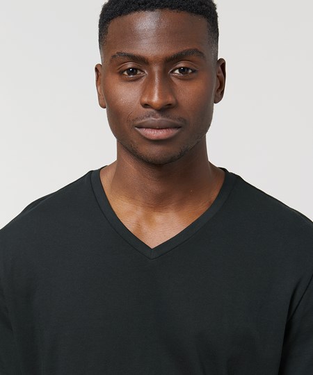 The men's v-neck t-shirt in 120gsm organic cotton features refined proportions and is designed with the perfect neckline and with a self-fabric construction.
