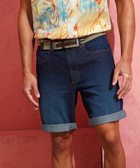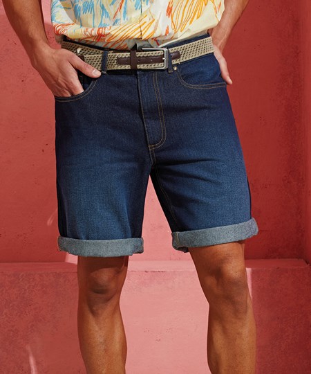What's better than a classic denim short? The fit of these men’s denim shorts is easier on the thigh, so you can easily style them rolled up at the hems. Washed for an authentic finish, they feature brass details with contrast stitching.